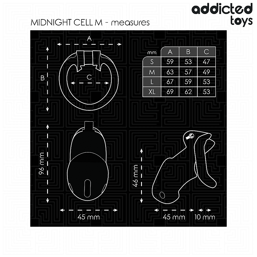 Addicted Toys Locked Midnight Cell Penis Cage M places the power in your partner’s hands, literally. Crafted from strong and safe material, this chastity cage ensures you stay comfortably secure for as long as the keyholder desires. With its adjustable fit—thanks to four rings in sizes 42mm, 49mm, 52mm, and 53mm—finding the perfect feel is easy. The built-in lock with two keys lets you decide who has control, keeping play exciting and risk-free. Lightweight design and compact dimensions make it suitable for discreet and prolonged wear. Suitable for beginners and seasoned enthusiasts alike, it adds a tantalizing layer to any dominance and submission dynamic or bedroom play.