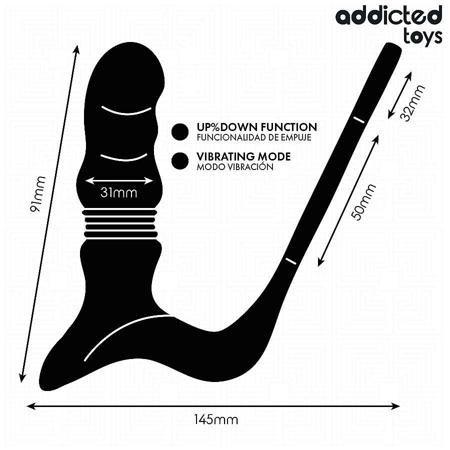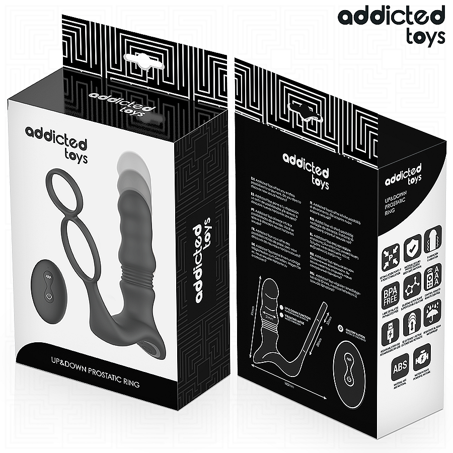 Up and Down Prostatic Ring by Addicted Toys fuses three powerful motors with thrusting motion and rumbly vibrations for intensely focused prostate stimulation. Its ergonomic curved shape naturally follows your anatomy to hit the right spot with comfort and precision. Explore 9 thrusting functions, from gentle rhythmic pulses to deeper, stronger strokes, and fine-tune each moment with 9 vibration modes. A wide, stable base keeps play safe, while the integrated double ring offers a secure grip and improved control. Operation is intuitive—use the on-device buttons or the wireless remote for discreet control. Quiet performance protects your privacy so you can stay in the moment. Premium silicone feels silky, is body-safe, and cleans easily, delivering a smooth glide even during longer sessions. Magnetic USB charging is convenient; after 120 minutes of charging, enjoy up to 70 minutes of powerful play. Its sleek, discreet design makes it a refined companion anytime.