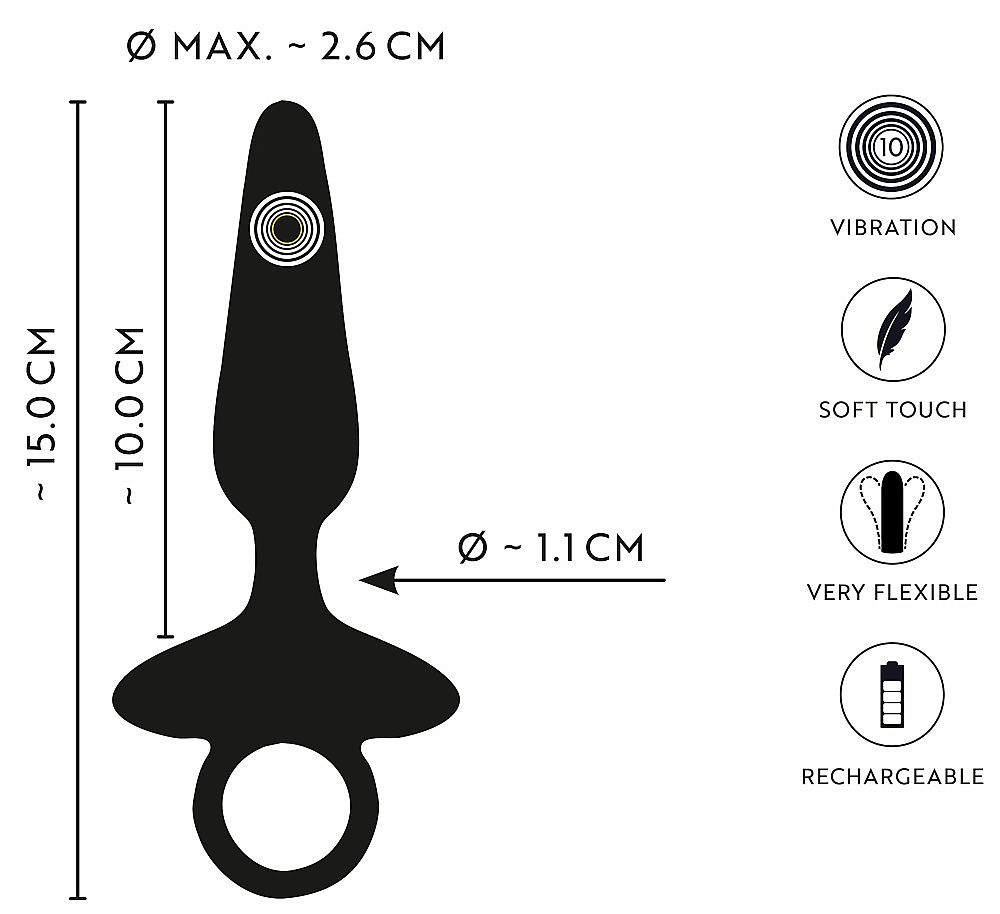 ANOS Flexible Butt Plug With Vibrations (Black) slips in gently with its slim, cone-shaped tip and velvety soft silicone that caresses every move. Its flexible body adapts to your rhythm for sensual, confident stimulation. A wide stopper with a practical ring keeps it from going too deep and lets you remove it easily when the heat rises. The powerful yet quiet motor delivers 10 intense vibration modes—from gentle buzz to pulsing waves—and the single-button control makes switching sensations effortlessly cheeky. The rechargeable design with included USB cable keeps your plug ready for the next round anytime. With a total length of 15 cm, 10 cm insertable, and a max diameter of 2.6 cm, it’s tailor-made for beginners and curious couples who crave varied anal fun. A light 81 g ensures comfortable wear and long-lasting pleasure.