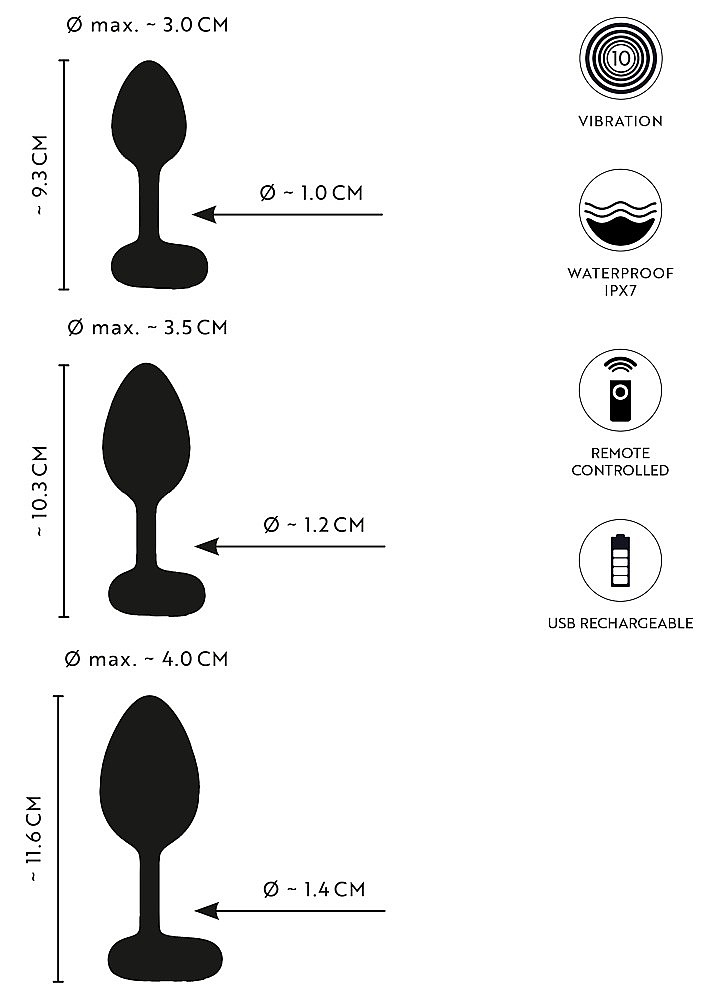 - Size S: insertable 7.3 cm, total 9.3 cm, max Ø 3 cm