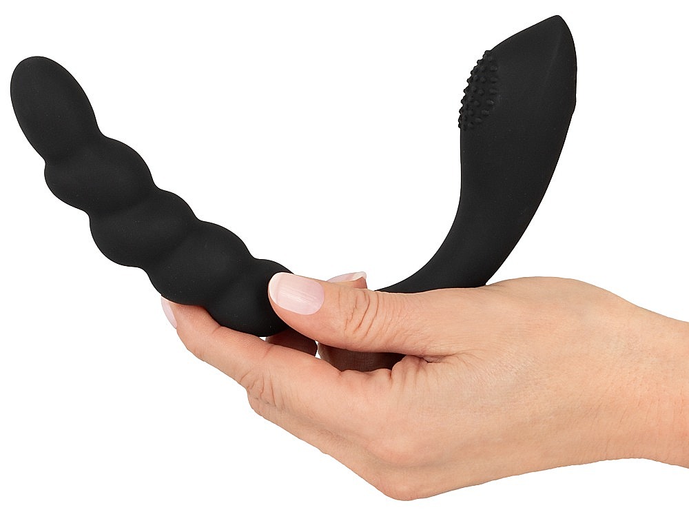 Black Velvets Bendable Dual Stimulator blends a ball vibrator and a lay-on vibrator in one highly flexible body that cuddles your curves. Its adaptability enables simultaneous internal and external stimulation and it’s perfect for both vaginal and anal play. Each end delivers intense vibes powered by two quiet, strong motors—one per end—with 10 varied vibration modes on each side. Effortless one-button control on the lay-on side keeps you focused on the fun. Fully waterproof, it’s ready for shower and bath adventures. The velvety-silky silicone with PU finish feels luxuriously smooth on skin. The ball end inserts easily while the lay-on end positions precisely where you want it. Vibrating soft dots tenderly caress the clitoris or testicles for extra tickly thrills. It’s rechargeable and always ready—USB charging cable included. Total length 26 cm; ball vibrator insertion length up to 16 cm, max Ø 2.8 cm; lay-on Ø 3.3 cm. Weight 150 g. Elegant black.
