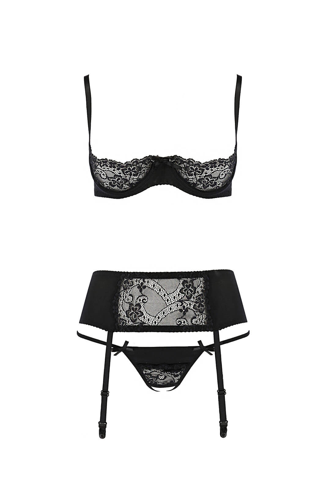 You will shine at the right moment. Aurelia set with open bra and wedge. Nice fabric with lace. Available sizes S to 3XL. Includes bra, garter belt and thong.