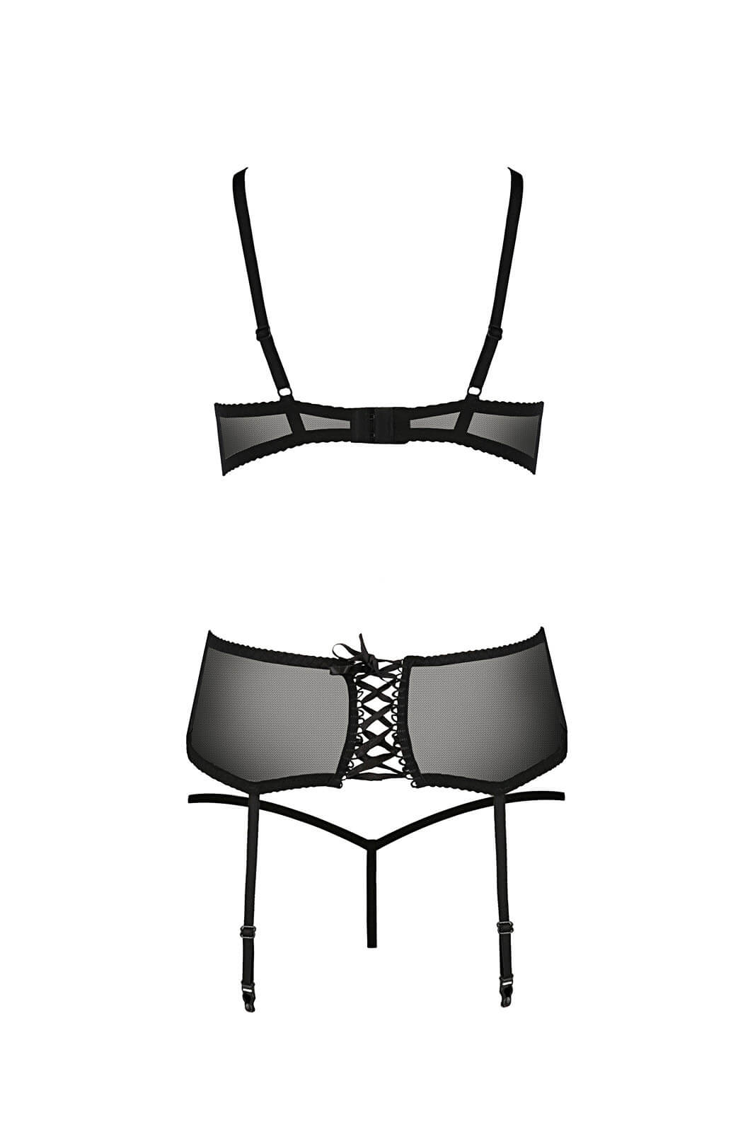 The AURELIA set is equipped with an open lace bra with sewn-in underwire, which will perfectly emphasize your curves and create an irresistible cleavage. Length-adjustable straps allow for a perfect fit to your figure, while a two-position hook-and-loop hem gives you the level of comfort you want.