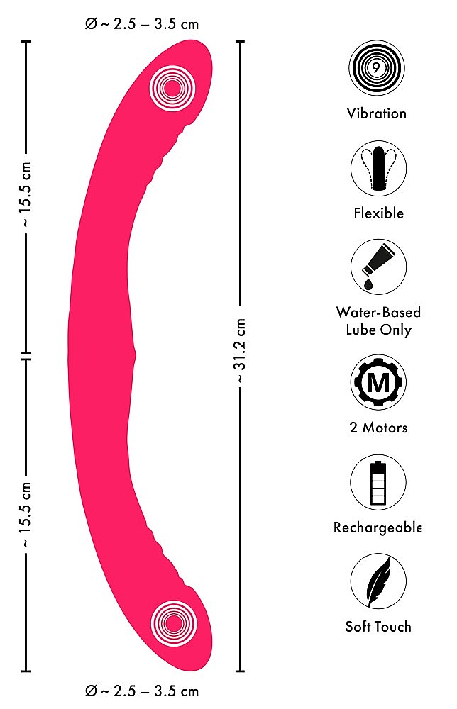 Couples Choice Double Vibrator glides effortlessly with its velvety-soft silicone finish. The Couples Choice Double Vibrator features two smartly sculpted tips with stylized glans for easy insertion and thrilling stimulation. Its flexible body adapts to your moves and works beautifully between two bodies—perfect for doggy or a cheeky crab style. Two powerful motors fire up both ends at once for shared, intense climaxes. Nine vibration modes deliver a symphony of sensations, while gentle grooves and waves add extra sparkle to every stroke. Control is a breeze with a single button in the middle—one press and the fun begins. It’s USB rechargeable, so it’s always ready when you are. A generous total length of 31.2 cm fuels the fantasy, with 15.5 cm insertable at each end, and a 2.5–3.5 cm diameter that balances comfort and fullness. The pink color is playful, and the 280 g weight gives a confident hand-feel. With its plush touch and flirty nature, this is an erotic toy you’ll come back to again and again.