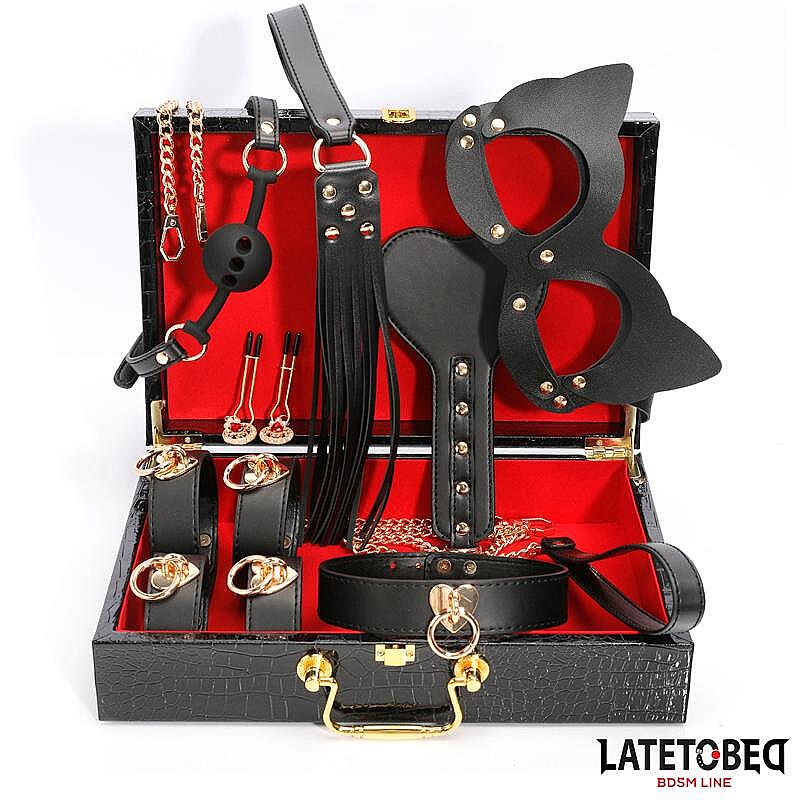 LATETOBED BDSM LINE 8 Piece Leather Bondage Kit with Storage Case by LATETOBED is a complete leather BDSM set designed for beginners as well as more experienced lovers of power play. It includes eight essential accessories that open the door to bondage, discipline, and erotic roleplay. The leather finish feels seductive and stylish, while the gold details add a luxurious, visually striking touch. Inside the set you will find leather handcuffs for restraining movement, ankle cuffs for deeper control, a kitten mask for playful fantasy scenarios, a breathable leather ball gag with adjustable fit for better comfort, a flogger for teasing impact play, a nipple clamp for exploring sharper sensations, a heart-shaped paddle for passionate spanking, and a leather collar with leash for seductive dominant-submissive games. The included storage case with a snake pattern keeps every piece neatly organized and makes the whole kit easy to store and transport.