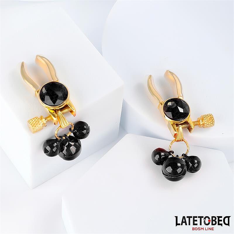 LATETOBED BDSM LINE Nipple Clamps with Bell by LATETOBED are designed for lovers of intense and darker pleasures who want an erotic accessory that is both stylish and functional. The slightly smaller clamps create a more delicate look than standard designs while still delivering delicious pressure and a thrilling sense of control. The metal construction offers firmness, durability, and a cool touch that can heighten arousal from the first contact. Small black bells add a seductive sound effect, turning each motion into a sensual signal that enhances the overall experience. Rhinestone details complete the design with a luxurious, glamorous, and provocatively elegant finish.