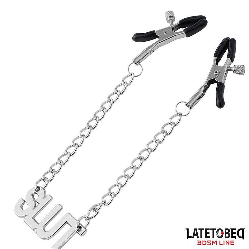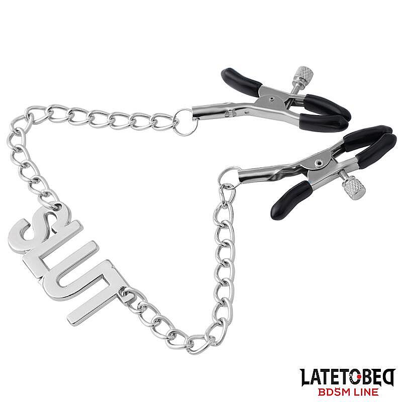 LATETOBED BDSM LINE Nipple clamps with Chain SLUT by LATETOBED BDSM LINE are classic nipple clamps with a chain, created for lovers of intense and playful BDSM sensations. Their fully adjustable design lets you fine-tune the pressure to match your mood, whether you crave soft teasing or a firmer, more demanding squeeze. The protective covers help shield delicate skin from damage while improving comfort during wear. The connecting chain adds both visual appeal and practical control, intensifying erotic tension and making every touch, pull, and movement feel even more exciting.