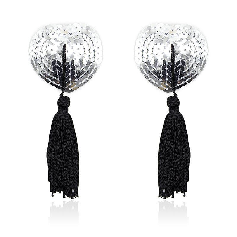 LATETOBED BDSM LINE Self-Adhesive Heart Sequin Nipple Cover with Tassel by LATETOBED is designed for lovers of intense and darker pleasures. The heart shape creates a flirty yet provocative look that instantly draws attention. Its self-adhesive design makes application simple and practical while helping the covers stay in place with minimal effort. The silver sequin-covered surface catches the light beautifully, creating a luxurious shimmering effect with every movement. The hanging black tassels add playful motion, seductive energy, and a distinctly erotic touch that stands out during dancing, foreplay, or daring photoshoots. The one-size design makes this accessory easy to choose and easy to enjoy as a striking addition to a seductive wardrobe.