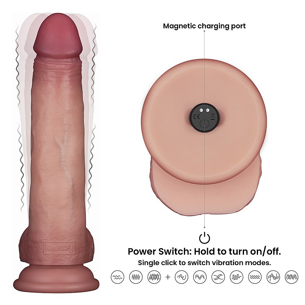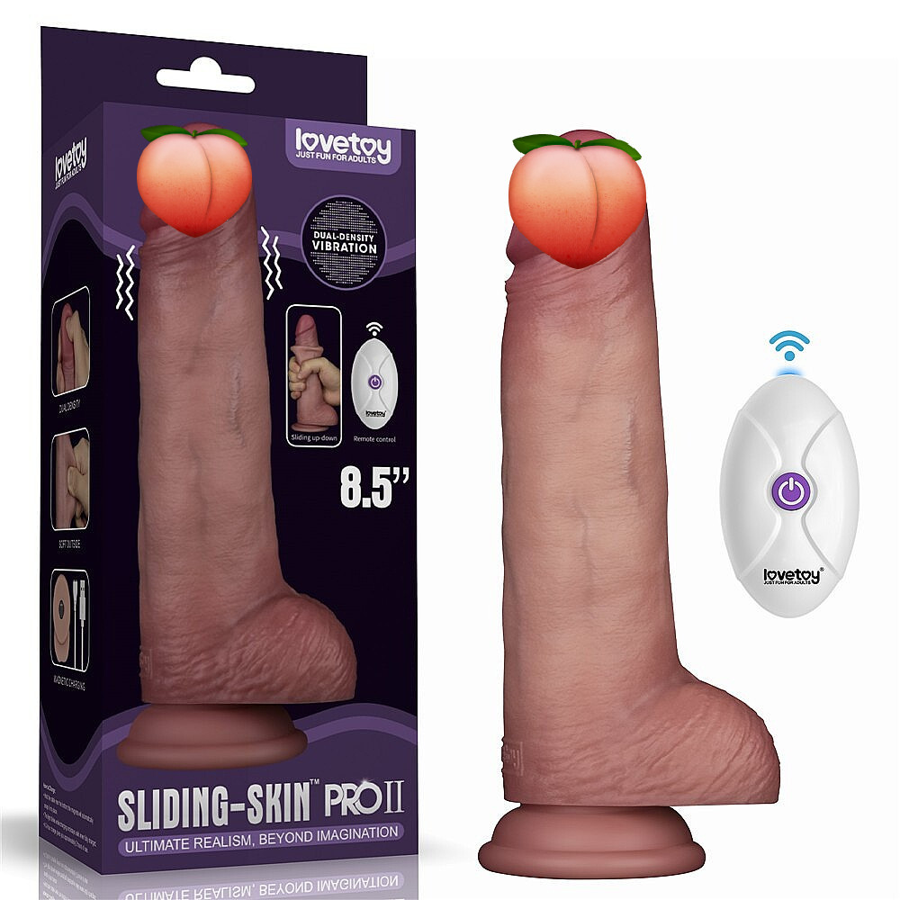 Lovetoy Sliding Skin Pro II 8.5" Vibrating Silicone Dong by Lovetoy brings second-generation sliding-skin technology to a more refined and pleasurable level. Its advanced medical-grade silicone outer layer feels softer, finer, and more comfortable against the body, while the firmer inner core creates a convincing erect feel for more authentic stimulation. The dual-density construction heightens realism and gives every movement a deliciously natural response. With 10 powerful vibration modes, this dong offers a versatile range of sensations, from gentle teasing to more intense erotic play. The wireless remote control makes operation effortless and opens the door to more playful solo sessions and partner exploration. USB-rechargeable functionality adds convenience, making it easy to enjoy again and again without the hassle of disposable batteries. Its realistic shaft, tactile detailing, and lifelike sliding-skin finish create a sensual experience that is immersive, durable, and delightfully provocative. For the smoothest glide and maximum pleasure, pair it with a water-based lubricant.