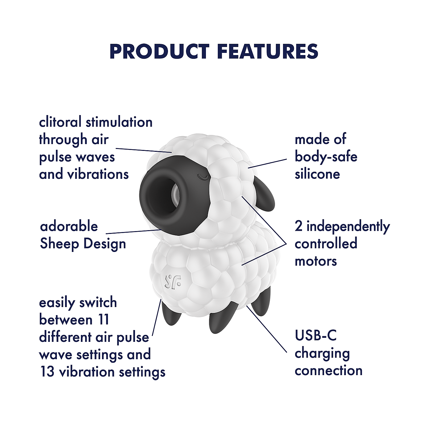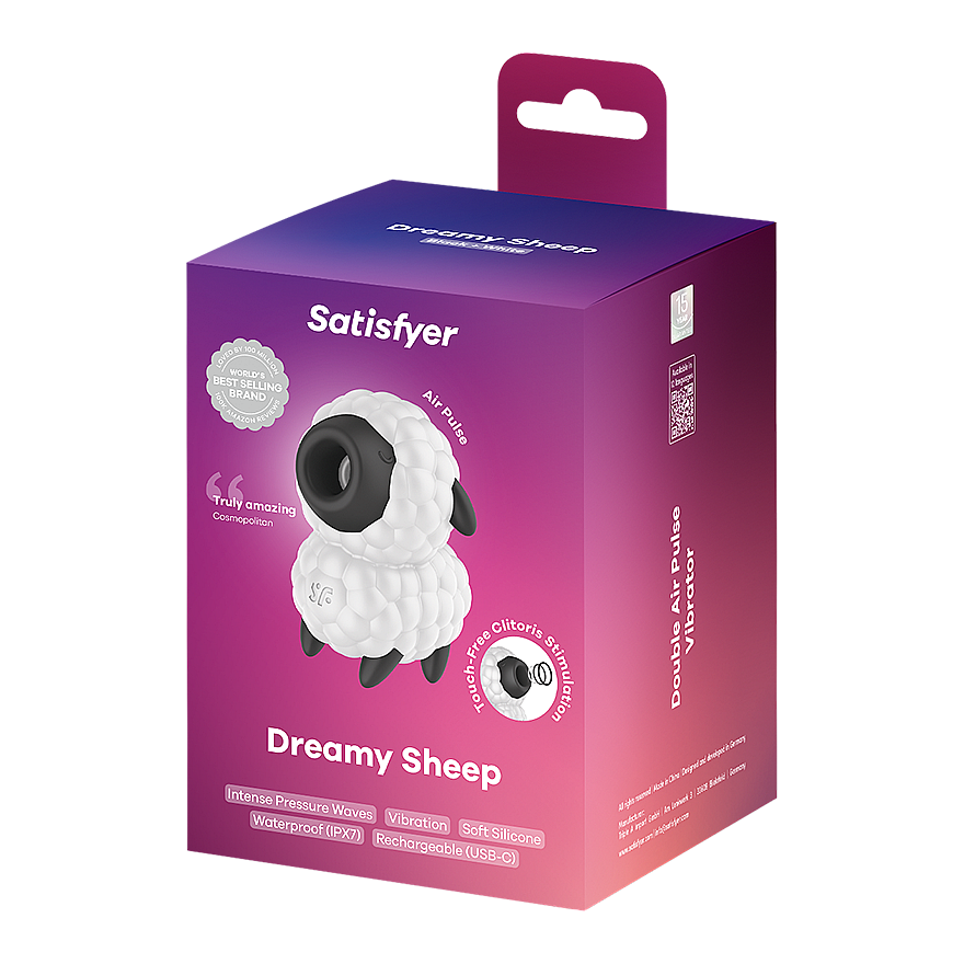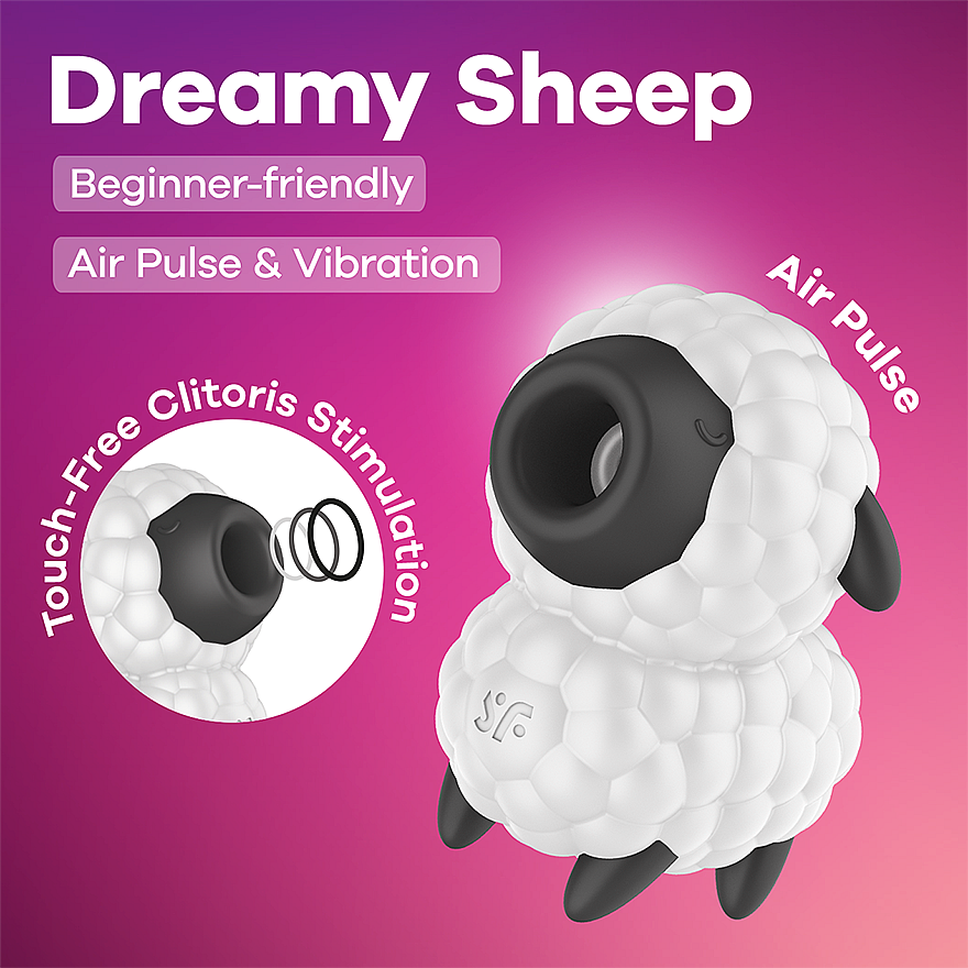 Satisfyer Dreamy Sheep is compact and lovingly shaped to hug your clitoris without direct contact, pampering it with soft air pulses and powerful lay-on vibrations. Satisfyer Dreamy Sheep delivers two thrills in one, making every touch playful and oh-so-erotic. Choose from 11 air-pulse intensities for a gentle rise to rapture, then add 13 vibration programs for a symphony of rhythms. Two individually controllable motors let you mix and match pulses and vibes to your exact mood. Whisper mode keeps playtime discreet. The silky, body-friendly silicone “wool” feels tender yet intensely arousing. Its IPX7 waterproof build invites enticing shower or bath fun and makes cleaning a breeze. A long-lasting lithium-ion battery recharges via USB-C so you’re always ready to play. Easy cleaning keeps it fresh and hygienic. Cute, discreet, and beginner-friendly, it’s perfect for exploring sweet, focused clitoral bliss.