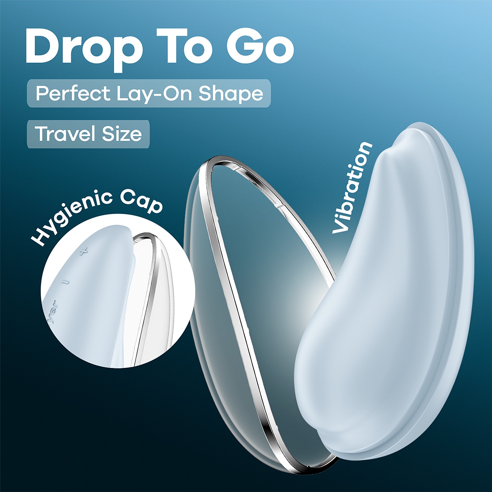 Satisfyer Drop To Go (Blue) is a lay-on clitoral vibrator shaped like a drop to nestle perfectly against your hot spots. Its 12 vibration programs range from teasing to toe-curling intensity. Super-soft, medical-grade silicone with a double-soft feel glides like velvet and stays ultra hygienic. The hygienic protective cap makes it a discreet, safe travel companion. Waterproof IPX7 invites steamy fun in the shower or bathtub. A powerful yet whisper-quiet motor keeps your pleasure discreet. Quick USB‑C recharge shortens the wait between sessions, while easy cleaning keeps it ready for your next adventure. Designed for beginners and connoisseurs alike with ergonomic handling and intuitive controls.