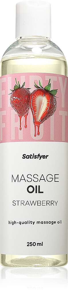 Satisfyer Massage Oil 250 ml (Strawberry) seduces with a juicy strawberry scent and transforms every massage into a flirty, sensual ritual. Satisfyer Massage Oil 250 ml (Strawberry) glides on effortlessly, spreading smoothly and leaving skin soft, touchable, and craving more—without greasiness. Its silky texture absorbs beautifully, inviting long, lingering caresses. The fresh strawberry aroma energizes the mood and adds a delicious, playful twist. A nourishing blend of plant oils (sunflower, soybean, jojoba) pampers skin with moisture and care. The neutral, gentle formula sets your imagination free—perfect for tender strokes or passionate foreplay. Easy application lets you use a small amount and reapply whenever you want to deepen the pleasure. Non-sticky glide keeps the touch seamless and sensual. The 250 ml volume is ready for countless intimate moments.