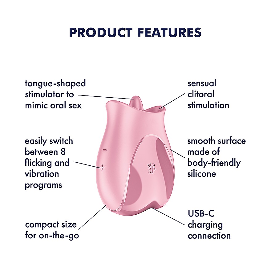 Satisfyer Tongue Lover treats you to a firm, high‑quality silicone tip that mimics real licking with precision, delivering targeted clitoral stimulation exactly where it counts. The super‑soft silicone transfers powerful vibrations deeply and deliciously. Choose from 8 flicking motions and 8 vibration patterns to slide from slow tease to fast, toe‑curling intensity. Its ergonomic grip groove keeps control effortless, while the whisper mode keeps sessions discreet. With IPX7 waterproofing, it’s perfect for steamy showers and easy cleaning. A USB‑C rechargeable lithium‑ion battery means it’s always primed for solo escapes or playful partner fun.