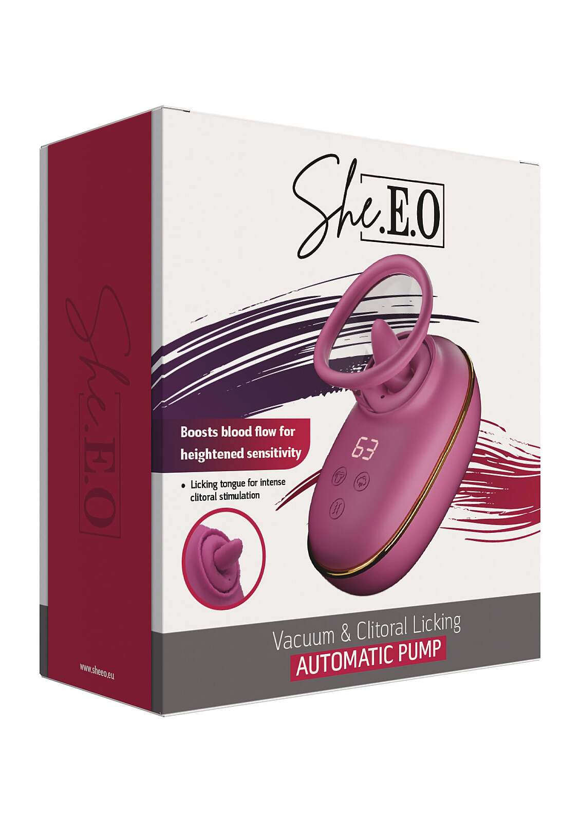 She.E.O presents the Licking Clitoral Automatic Pump, blending vacuum, licking, and vibration for deep stimulation. A soft rotating tongue gently massages the clitoris or nipples, sending ripples of delight. The vacuum cup boosts blood flow and sensitivity for fuller, sweeter sensations. With 9 vibration modes and 9 tongue rotations, you can dial in the perfect rhythm, while 3 suction levels add sensual pressure. Use the tongue without the cup for a deeper reach and more intense teasing. Made from body-safe silicone and ABS, it feels silky and hygienic. The ergonomic design fits comfortably in hand for precise targeting. USB rechargeable with a Li‑ion battery delivering up to 65 minutes after about 150 minutes of charging. With IPX6 water resistance, it’s shower‑ready. Compact 11 cm length and 285 g weight make it a perfect travel companion.