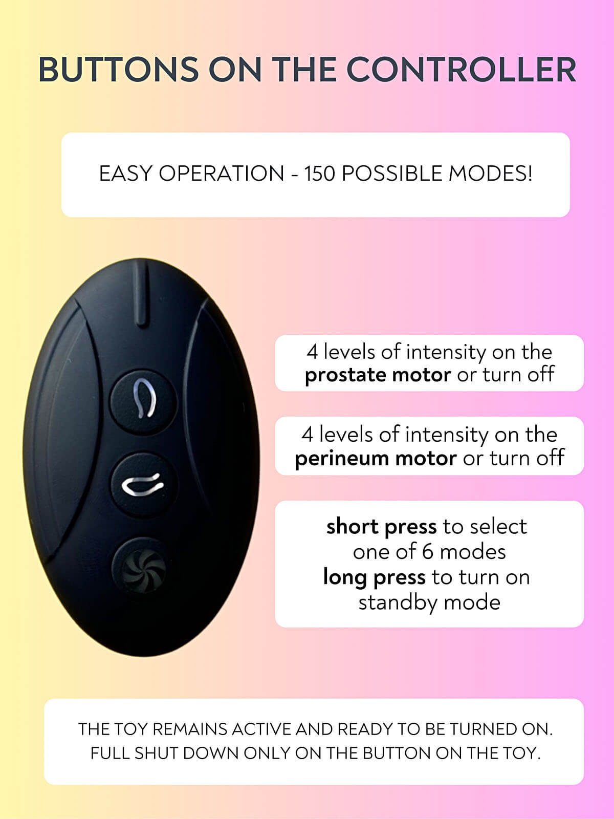 Thanks to the remote control with a range of up to 7 meters, you can easily change settings without having to interrupt your experience. Whether you are alone or with a partner, the remote control brings a new dimension of fun and convenience.