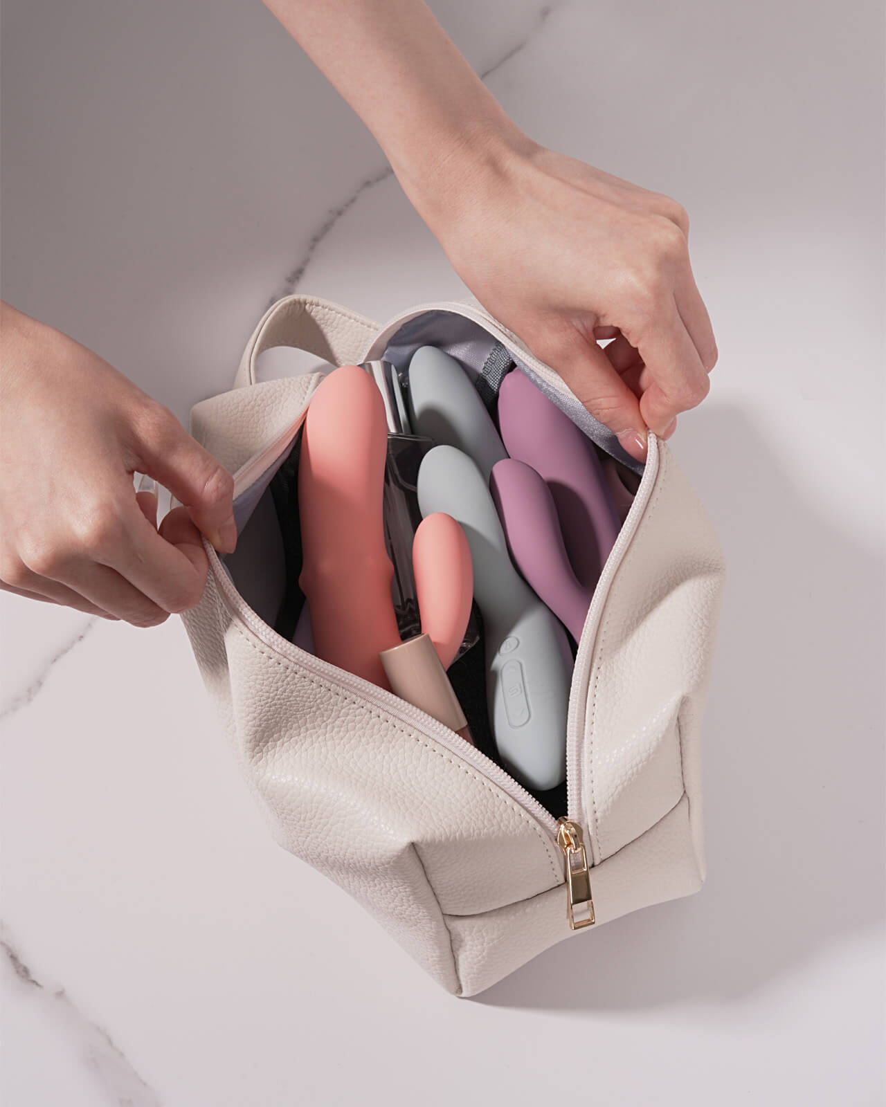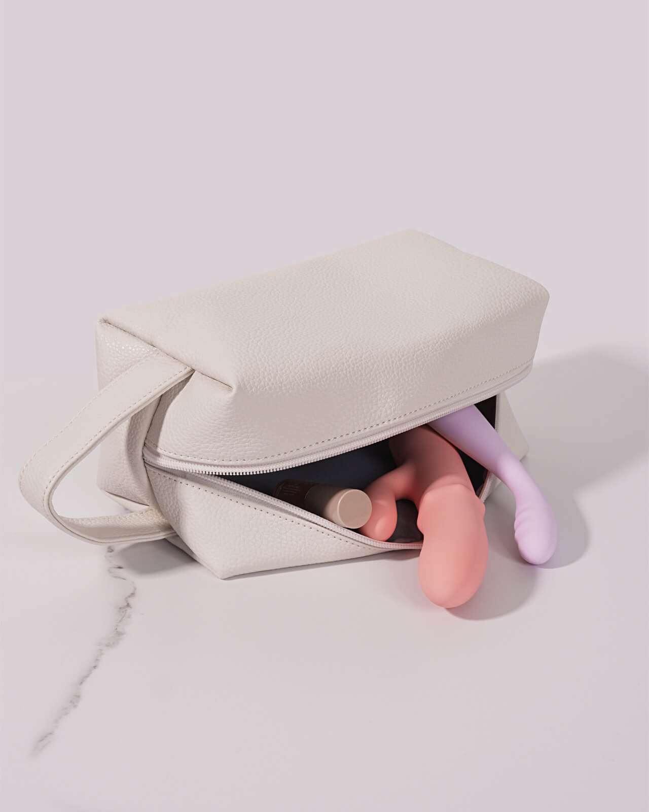 - Playfully spacious – it fits a vibrator, lubricant, and a couple of other favorite goodies.
