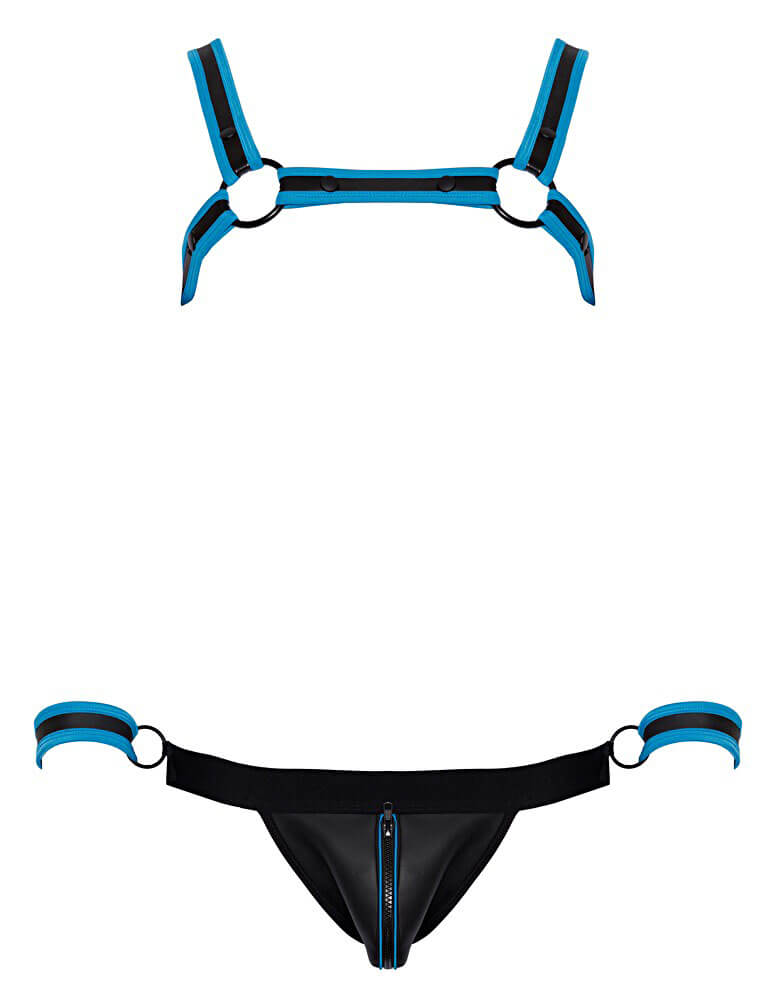 Erotic set for him: chest harness, jockstrap and wrist cuffs. All in a beautiful neoprene look!