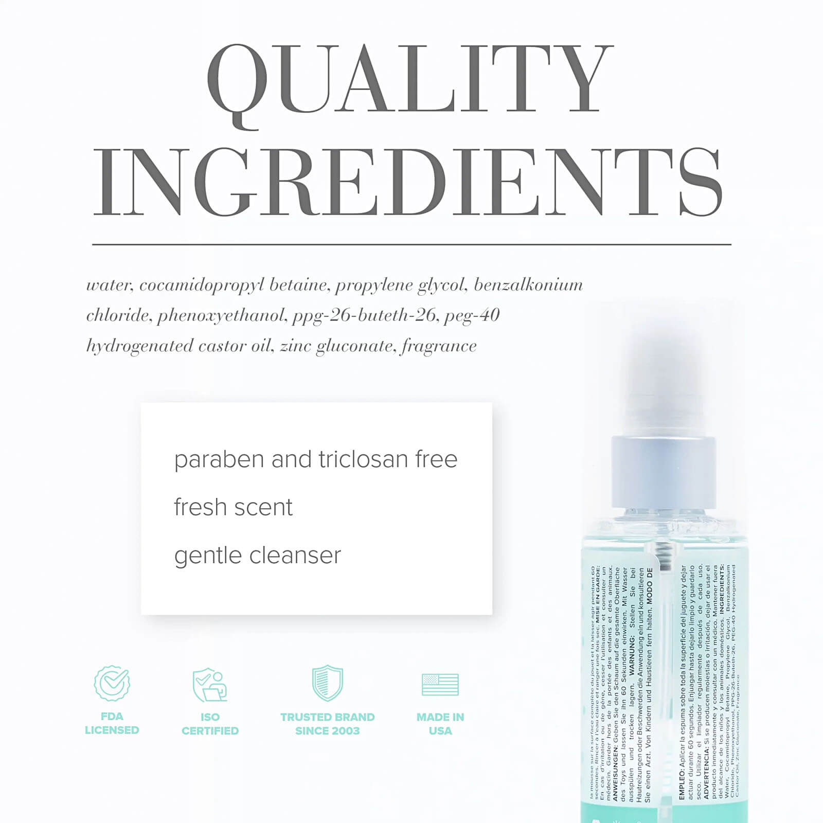 Water, Cocamidopropyl Betaine, Propylene Glycol, Benzalkonium Chloride, Phenoxyethanol, PPG-26-Buteth-26, PEG-40 Hydrogenated Castor Oil, Zinc Gluconate, Fragrance