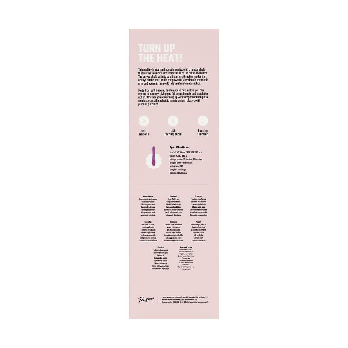 Teazers Heating Rabbit Vibrator (Purple) blends playful charm with power to thrill right where you want it. Two individually controlled motors take you from teasing tremors to pulsing ecstasy and let you fine-tune every sensation. The main shaft delivers 10 thrusting modes to move with your rhythm. The flexible rabbit arm focuses 10 clitoral vibration settings exactly where it counts. With a single press, the warming function brings you body-like heat for a sensually embracing touch. Its rechargeable design keeps the energy flowing without batteries. The super-soft silicone glides like velvet for a smooth, luxurious feel. Dressed in alluring purple, it invites you to mix, match, and melt into irresistibly erotic play—anytime.
