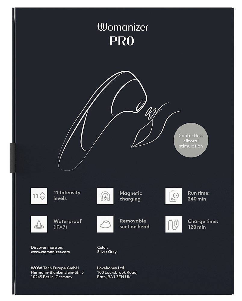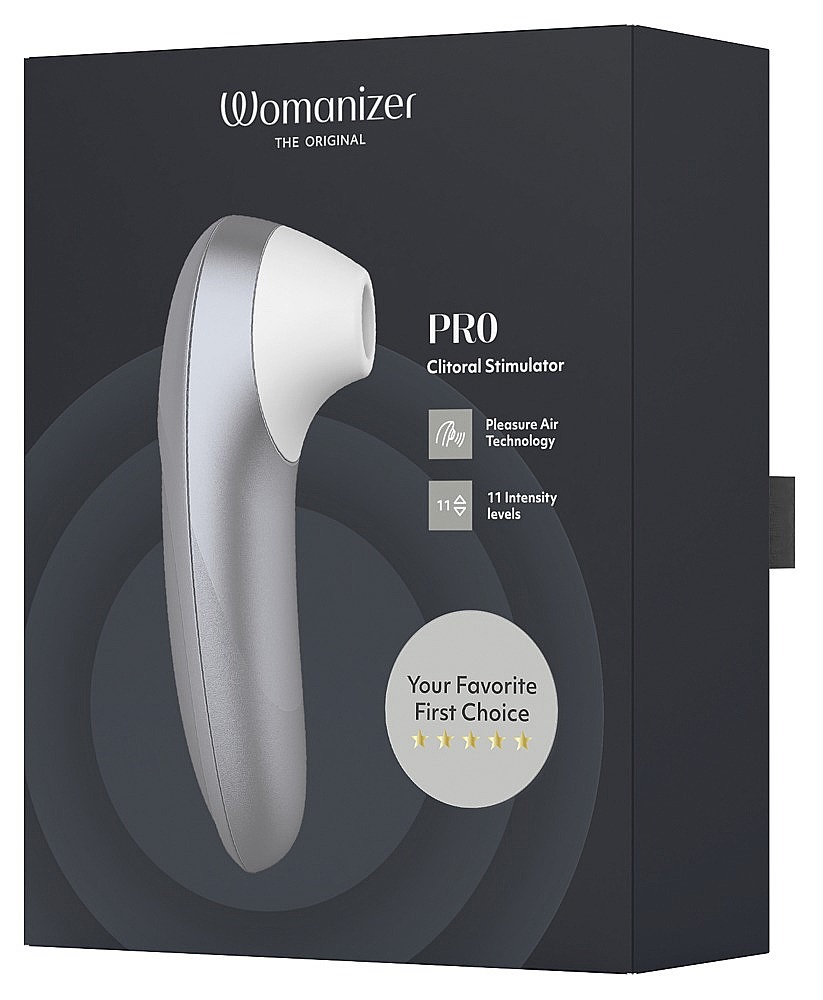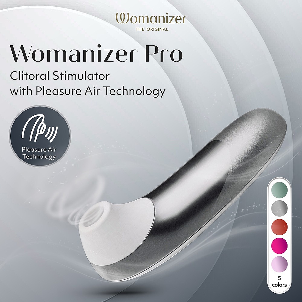 Womanizer Pro (Silver) delivers legendary touchless stimulation that surrounds the clitoris with silky air waves for pure, focused pleasure. With 11 Pleasure Air intensities, glide from feather-light teasing to deeply satisfying surges and control every peak. The whisper-quiet motor keeps your secret safe while you revel in quick, multiple orgasms within minutes. Its compact size slips into your hand or purse, and the intuitive controls let you change levels without breaking the spell. Enjoy wet-play freedom thanks to its waterproof build, and keep the fun going with USB rechargeable power. Silky silicone and durable ABS feel great on skin and clean easily.
