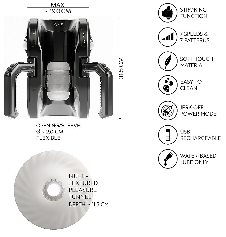 WYNE Masturbator 10 delivers fully automatic, intensely satisfying stimulation. The soft, stretchy sleeve with countless textures massages the penis along its length. Choose from 5 thrust lengths for quick, short strokes or long, deep dives. 7 movement modes keep every session fresh, while 7 speeds build tempo exactly as your body craves. Side handles give you secure grip and precise control—comfortable, fully automatic handjobs without tired hands. LED displays make settings crystal clear, so you can focus only on pleasure. The open-ended, removable sleeve is easy to clean and doubles as a manual stroker. And when it’s time to recharge, just plug in via USB. A robust build ready for intense rides whenever the mood strikes.